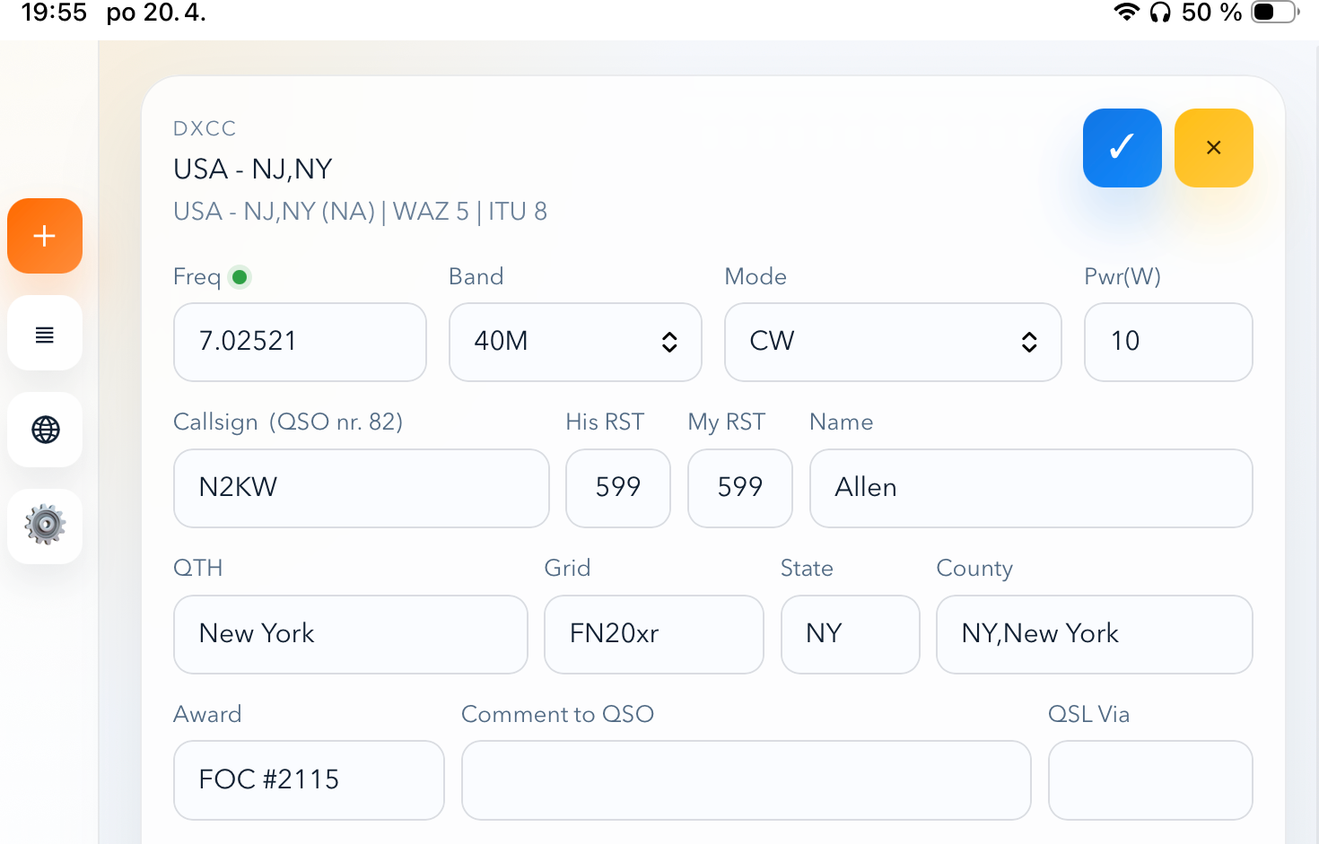 Pri návrhu rozhrania sa kládol veľký dôraz na to, aby sa používatelia cítili ako doma. Rozloženie polí v hlavnom formulári kopíruje logiku desktopovej verzie. Operátor má k dispozícii polia pre volaciu značku, frekvenciu, pásmo, mód, reporty RST, meno, QTH, lokátor, výkon, dátum a čas, poznámky, stav QSL, IOTA, WAZ, ITU, štát, okres a informácie o diplomoch.